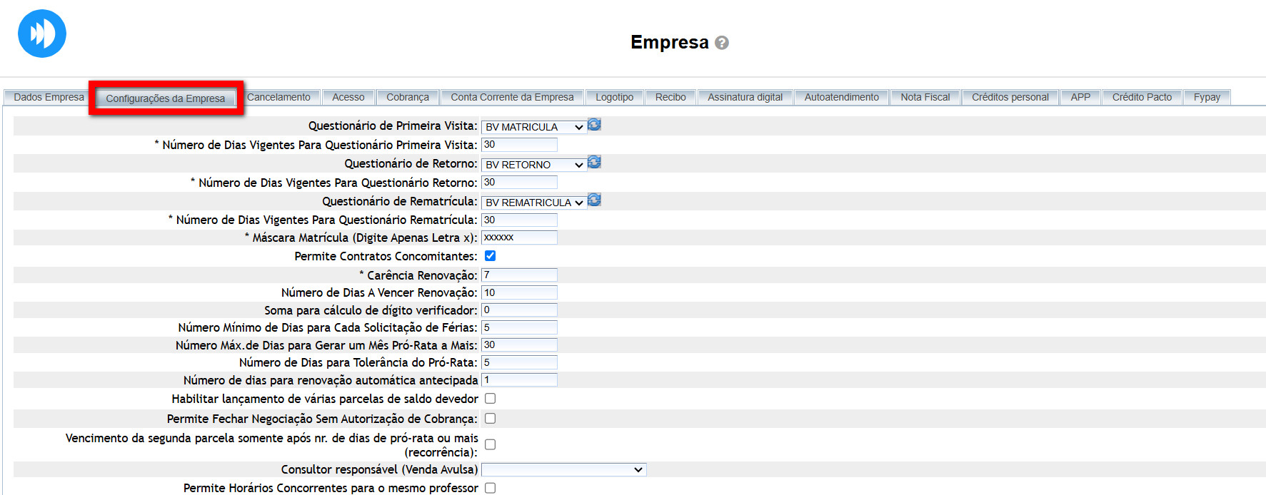 - Manter marcações futuras em renovação de contrato de crédito: ao marcar esta configuração, o sistema mantém as aulas agendadas do contrato anterior quando houver renovação do contrato de crédito.