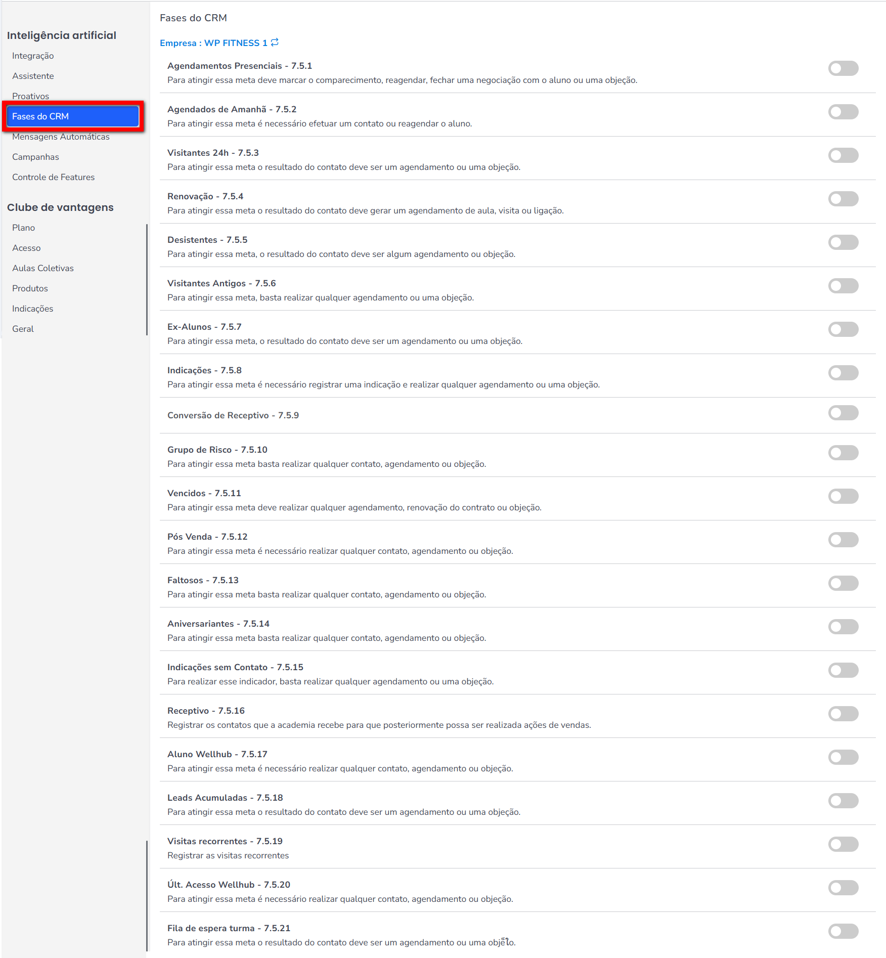 A tela de configurações estão concentradas as principais configurações referente aos módulos ADM, CRM, Financeiro, Treino e Inteligência Artificial.