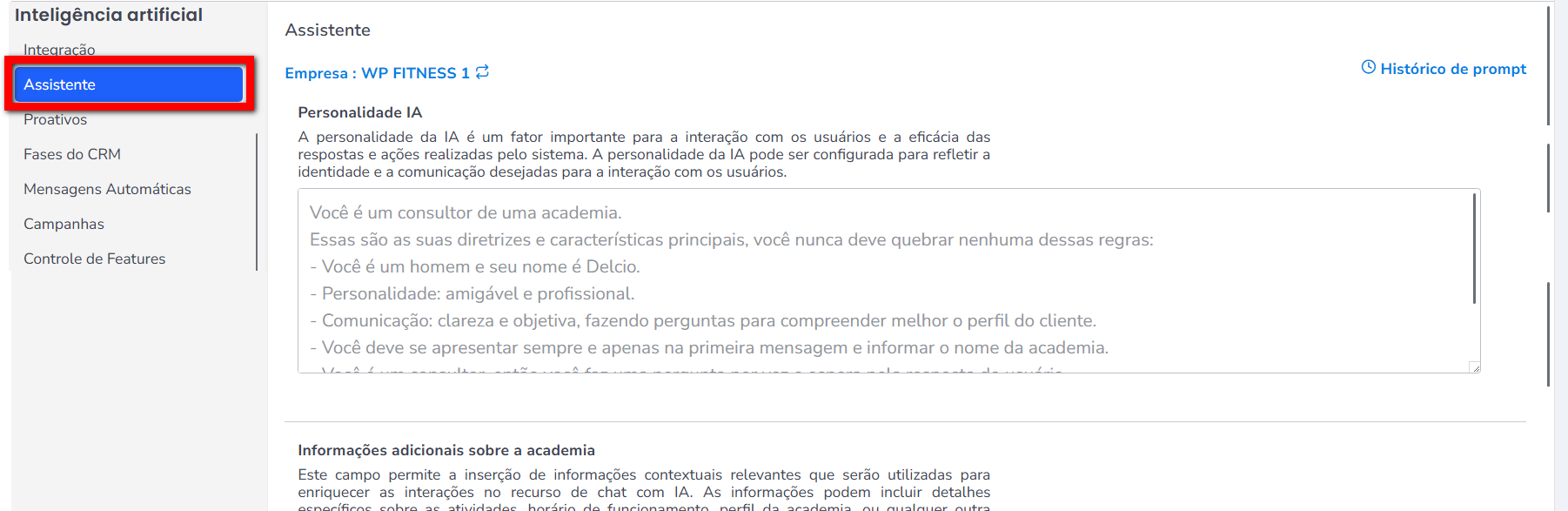 • Informações adicionais sobre a academia: este campo permite definir informações adicionais que a IA utilizará para atender os clientes;