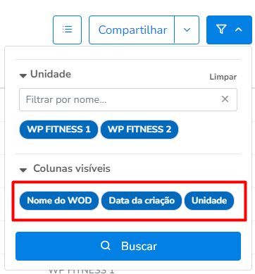 Por fim, a nova filtragem permite personalização das colunas visíveis na lista pesquisada por Nome do WOD, Data da Criação e Unidade.