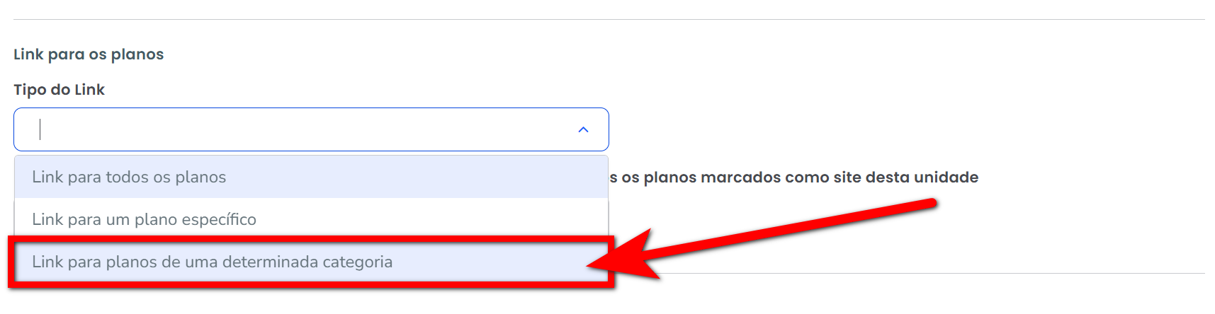 3. Localize o campo “Link para os planos” e, em “Tipo do link”, selecione a opção “Link para planos de uma determinada categoria”;