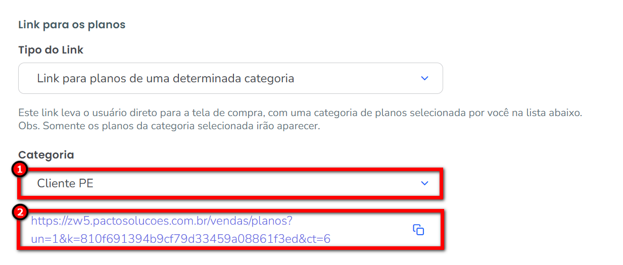 5. Com o link gerado, compartilhe com o cliente. Quando ele concluir a compra, o perfil será automaticamente vinculado à categoria do plano.