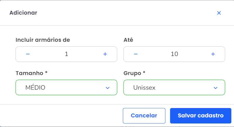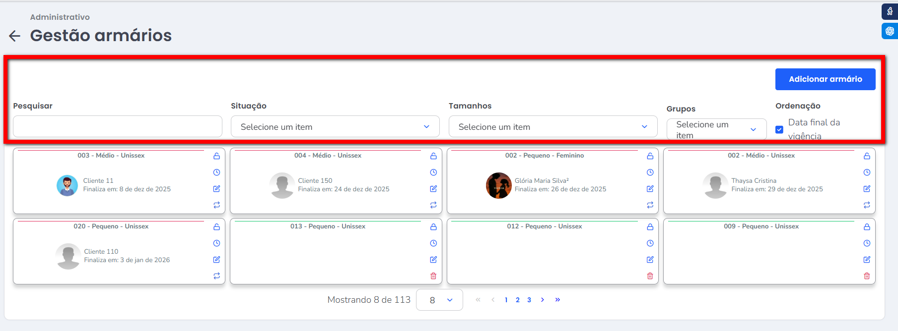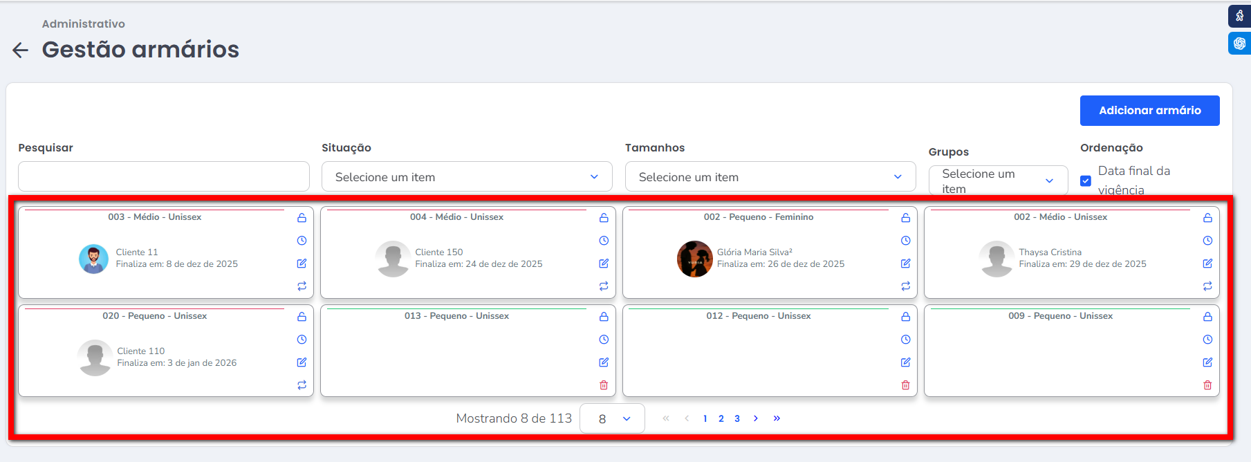 - Grupos: selecione o grupo de armários que deseja visualizar — Feminino, Masculino ou Unissex;