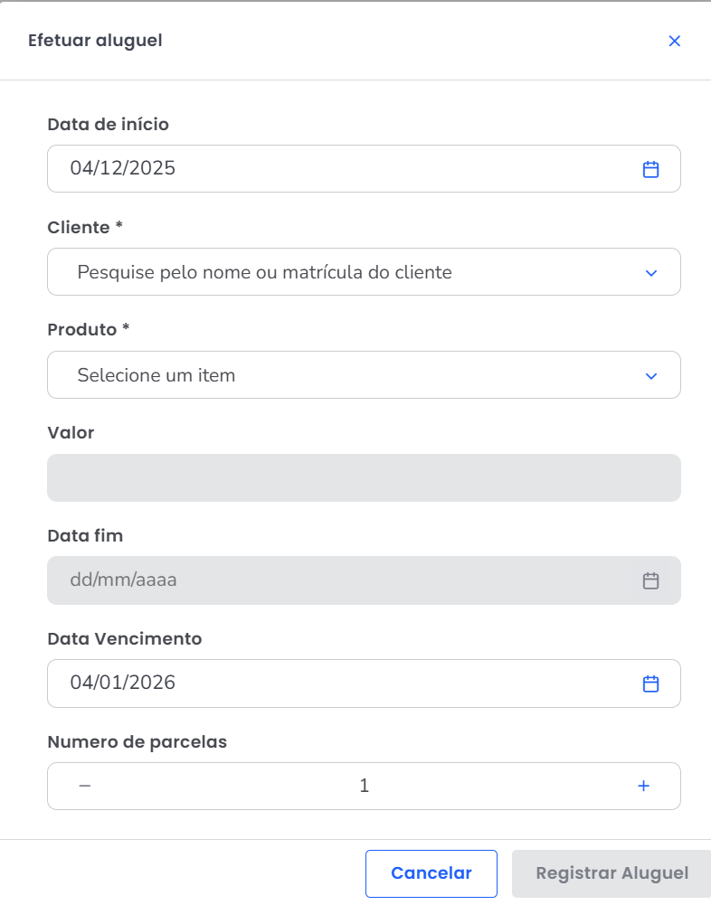 - Data fim: o sistema completa automaticamente a data de término do aluguel, conforme a configuração do produto de armário.