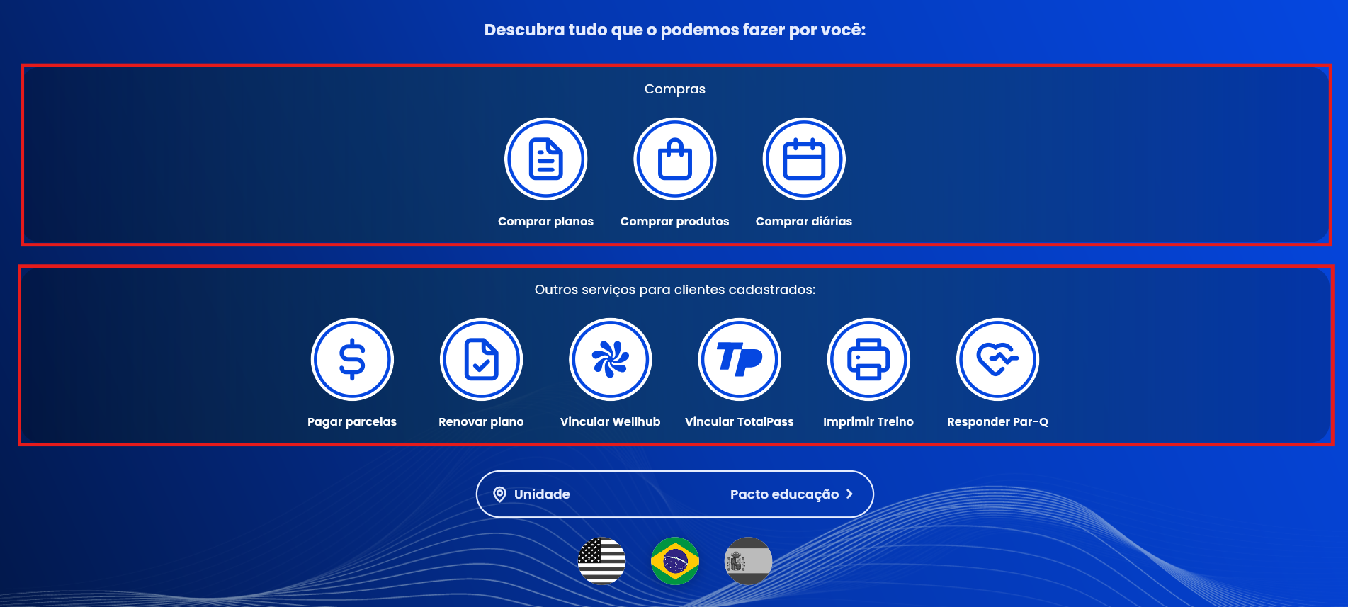 ✔ Outros Serviços – pensado para alunos que já fazem parte da academia, como cadastro de convênios (TotalPass e Wellhub) e outros.