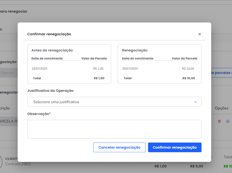 O operador precisa selecionar um motivo padronizado, cadastrado previamente em “Justificativa de operação”, antes de concluir a renegociação.