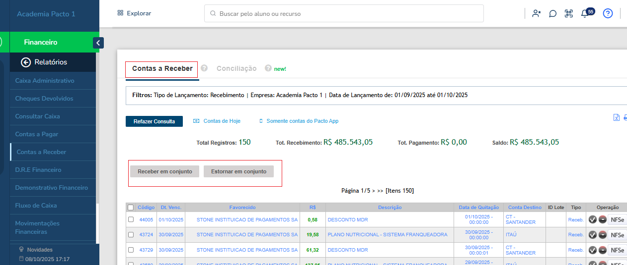 A funcionalidade de “Pagar em conjunto” e “Estornar em conjunto”, que já existia para Contas a Pagar, também está disponível para as Contas a Receber.