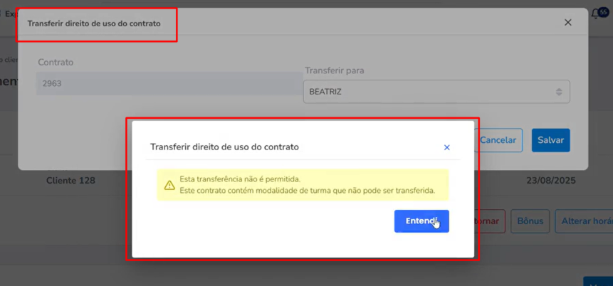 Por esse motivo, agora, o sistema bloqueia a transferência de contratos com modalidade de turma, para ajudar você a não perder o controle sobre essas trocar que envolvem horários fixos, quesitos de idade e outros.