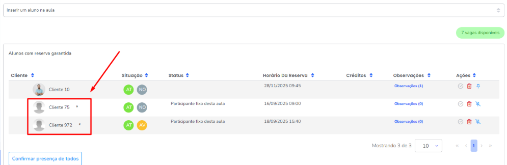 - Com um asterisco (*) ao lado do nome na Agenda de Aulas.