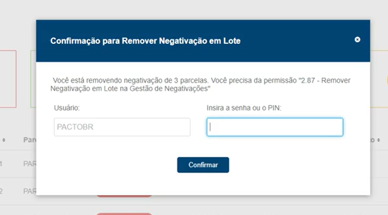 A partir de agora, quando você selecionar duas ou mais parcelas e clicar em “Remover Negativação”, o sistema vai pedir uma confirmação por senha antes de continuar a operação.