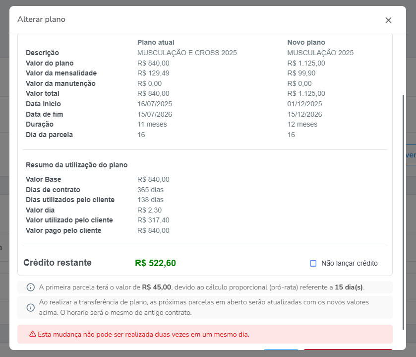 Com a nova atualização, ao realizar uma troca de plano, o sistema calcula automaticamente a diferença proporcional entre o plano antigo e o novo, considerando: