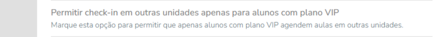 Somente alunos com Plano VIP poderão fazer check-in em aulas de outras unidades da rede. Quando desativada, tudo segue como hojeo habitual.