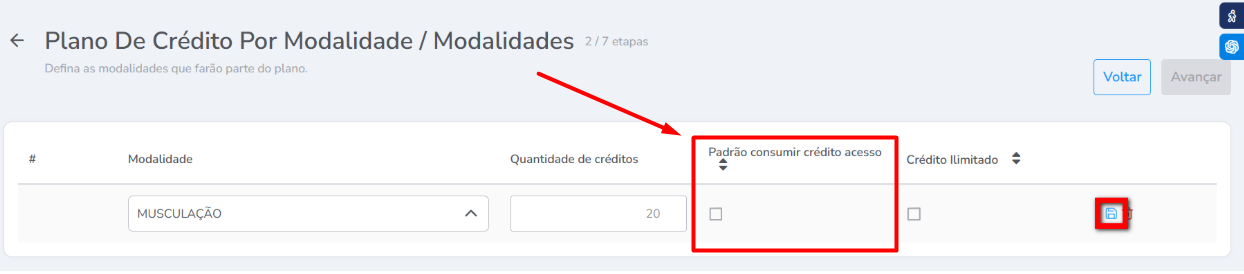 Para escolher qual modalidade irá consumir o crédito de acesso dentro de um plano, é necessário marcar a opção abaixo no cadastro do plano: