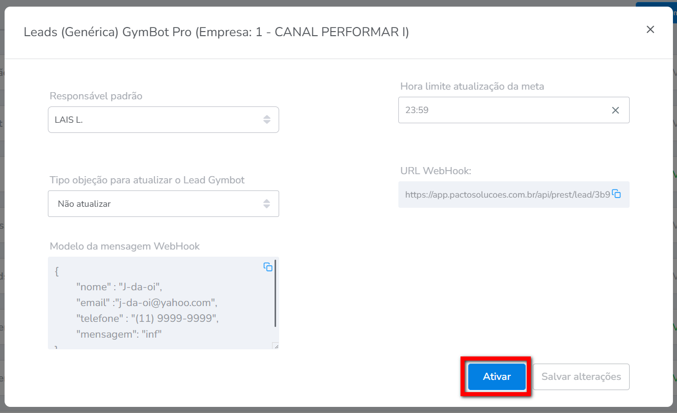 URL WebHook: copie o link clicando no ícone indicado e salve para configurar na plataforma Gymbot.
