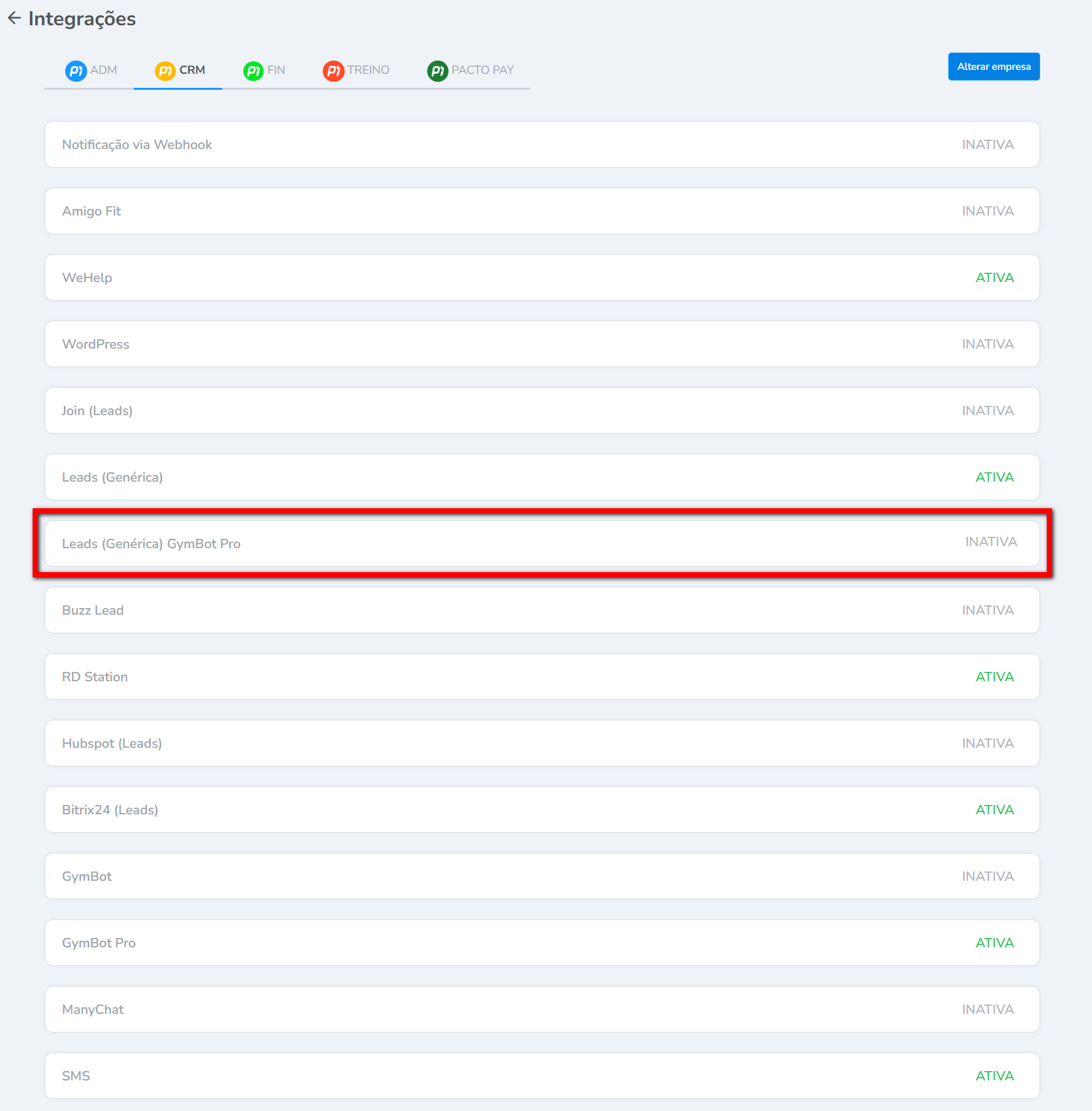 4. Será apresentada a tela de Integrações de todos os módulos do sistema Pacto. Clique no módulo “CRM” apresentado na tela e selecione a integração “Leads (Genérica) GymBot Pro“;