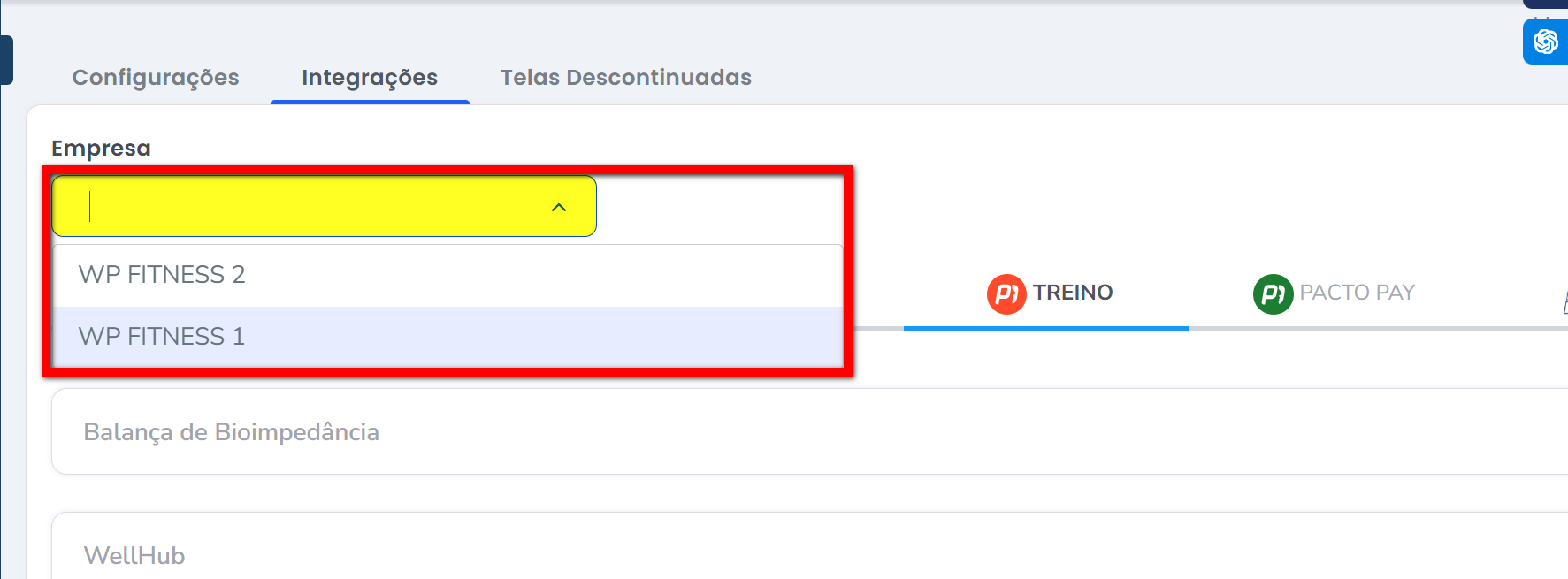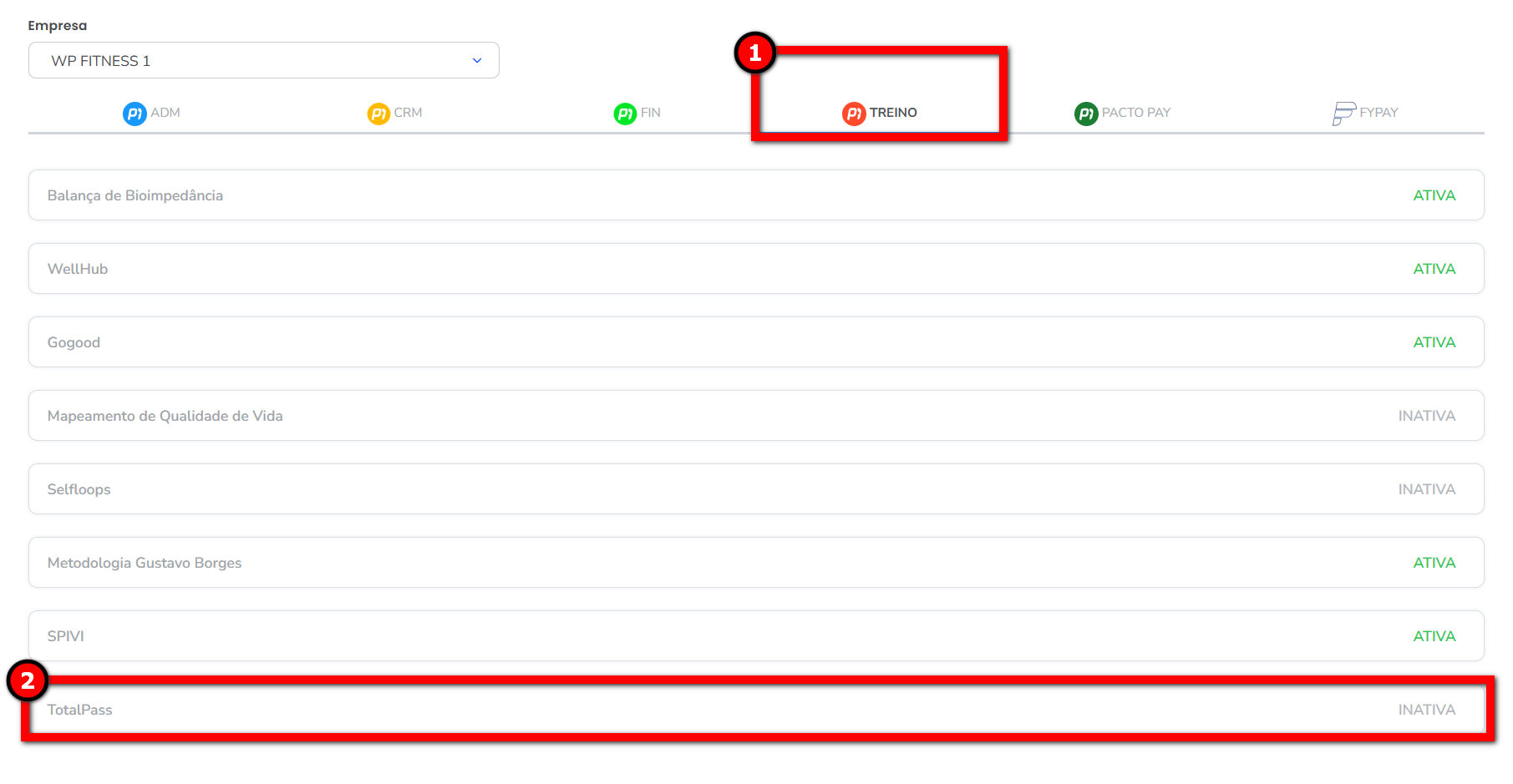 4. Será apresentada esta tela com todas as integrações disponíveis. Clique sobre a aba “Treino” e localize a integração “TotalPass”;