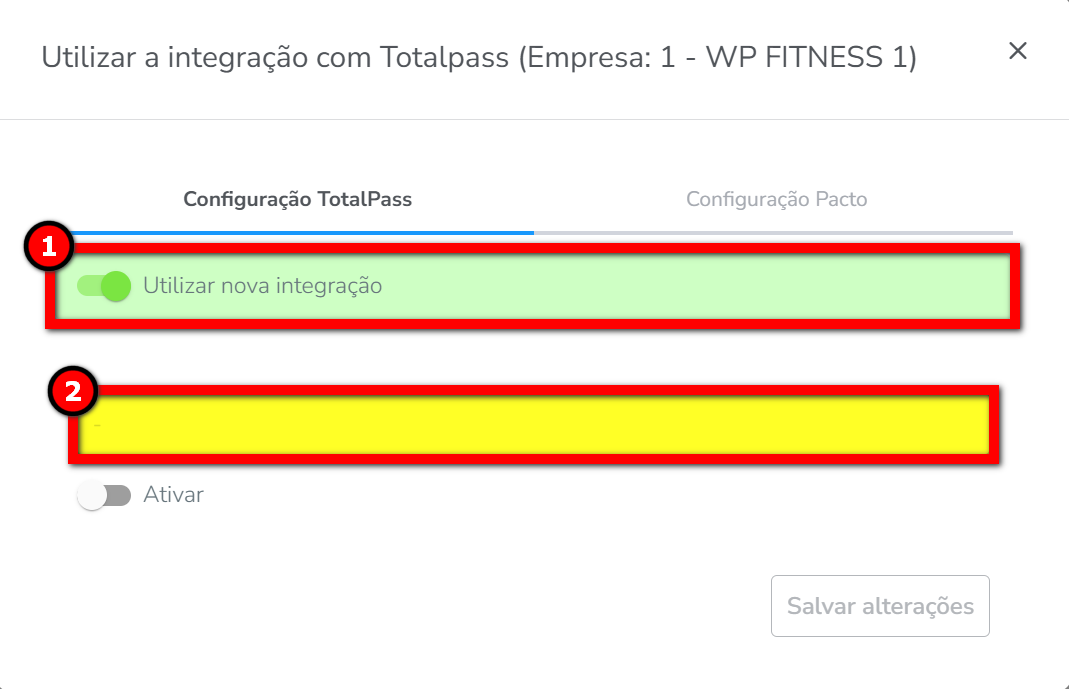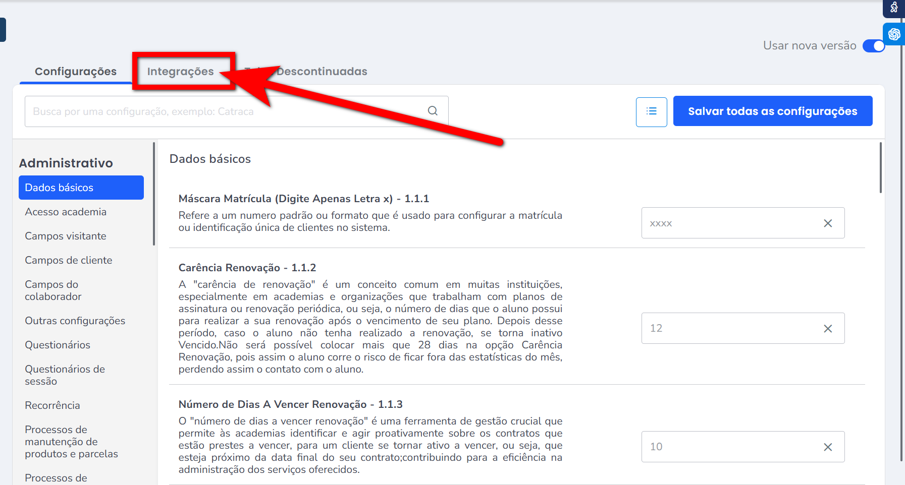 5. Habilite a opção “Utilizar nova integração”. Ao ativá-la, os campos antigos serão ocultados e um novo campo será exibido para preenchimento com a place_api_key da academia;