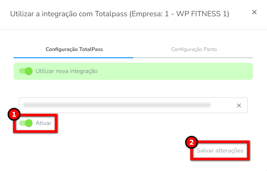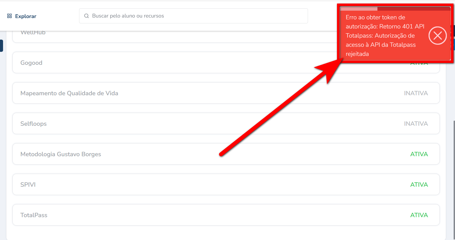 7.1. Se for informada uma place_api_key incorreta, o sistema não conseguirá autenticar a conexão com a API da TotalPass e exibirá a seguinte notificação “Retorno 401 API TotalPass: Autorização de acesso à API da TotalPass rejeitada”, indicando que a place_api_key está incorreta.