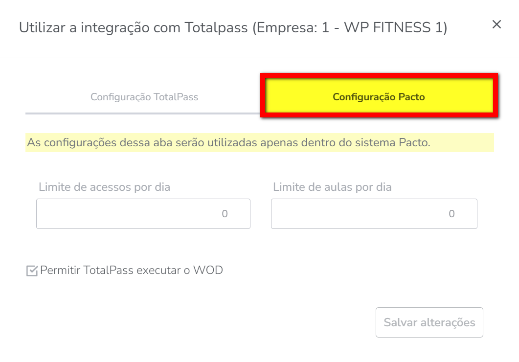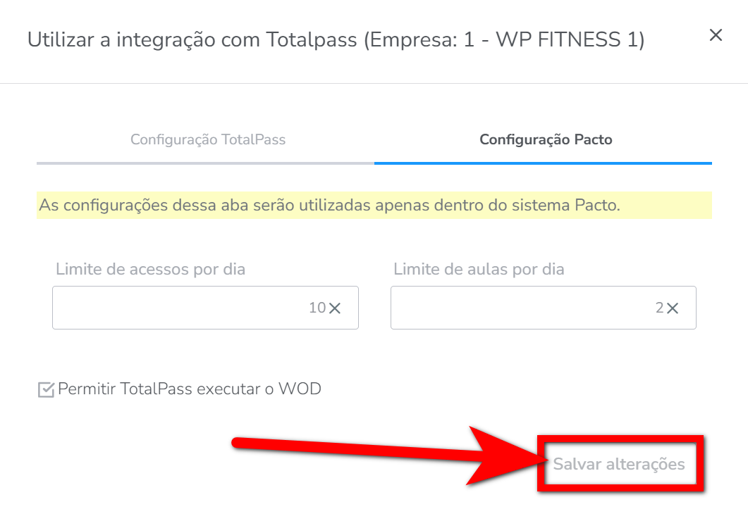 Observação: esta configuração limita somente alunos TotalPass que utilizam marcação de aulas coletivas pelas ferramentas da Pacto (Agenda, App Treino e RetiraFichas). - Permitir TotalPass executar o WOD: marque esta configuração caso trabalhe com a modalidade Cross e deseje que o aluno TotalPass, ao acessar o aplicativo Treino, possa executar o Wod.
