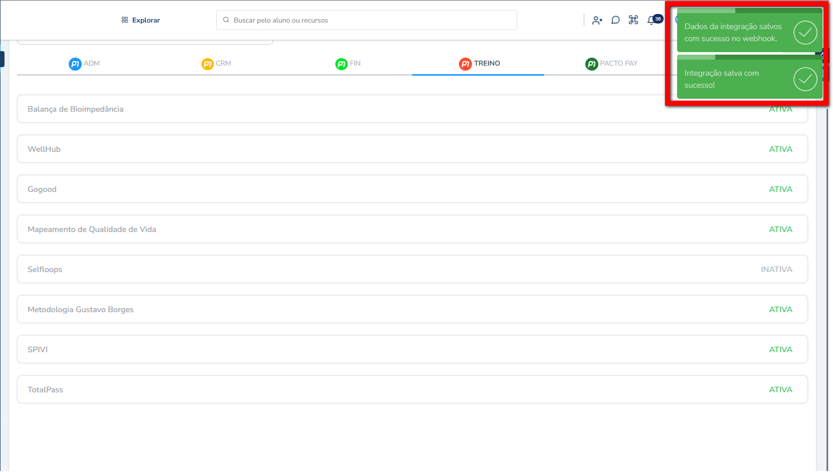 Dados da integração salvos com sucesso no webhook: indica que a place_api_key foi autenticada com sucesso na API da TotalPass e que a URL do webhook da academia foi enviada corretamente para a TotalPass.