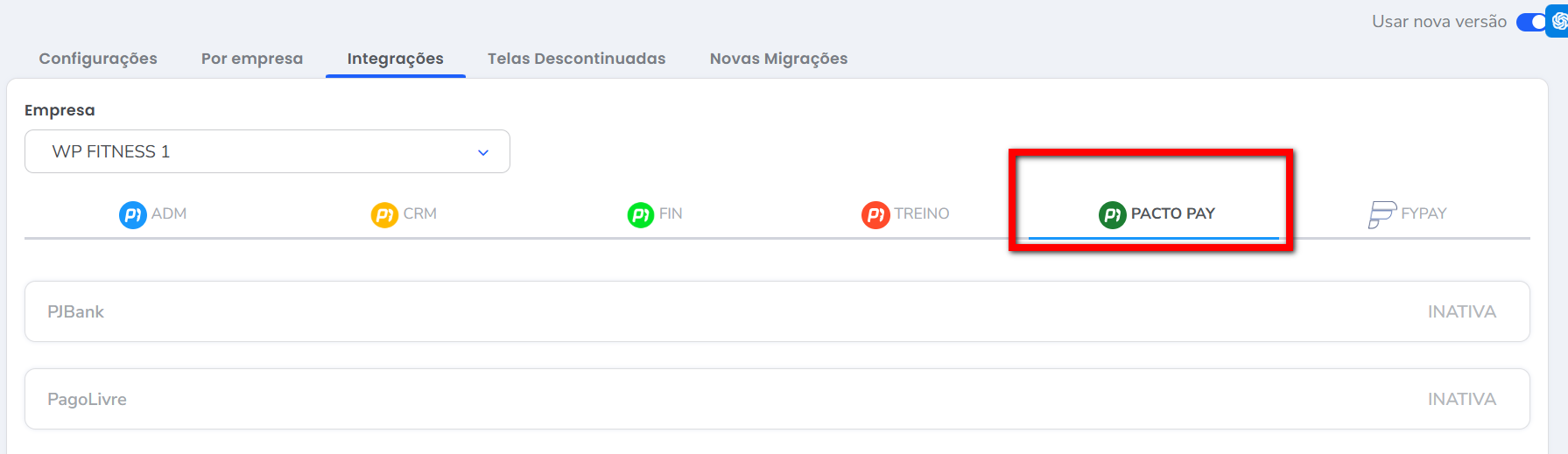 Na tela de Integração do módulo PactoPay estão centralizadas todas as integrações que estão disponíveis de configuração.