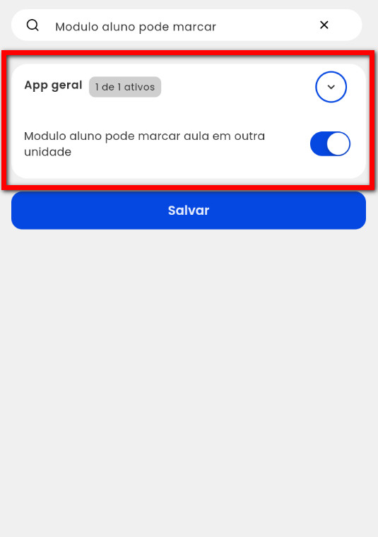 4. Localize e habilite a permissão “Modulo aluno pode marcar aula em outra unidade“;