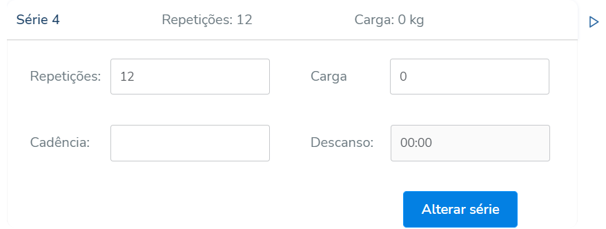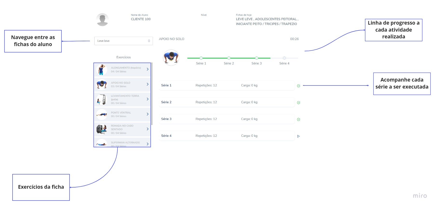 Durante o acompanhamento o professor pode alterar as configurações do exercício de acordo com a execução do aluno. Todas as alterações ficam salvas e podem ser consultadas na ficha a qualquer momento.