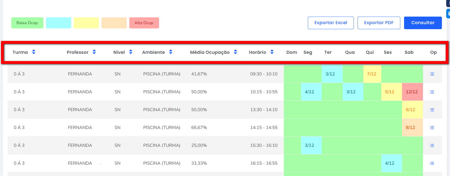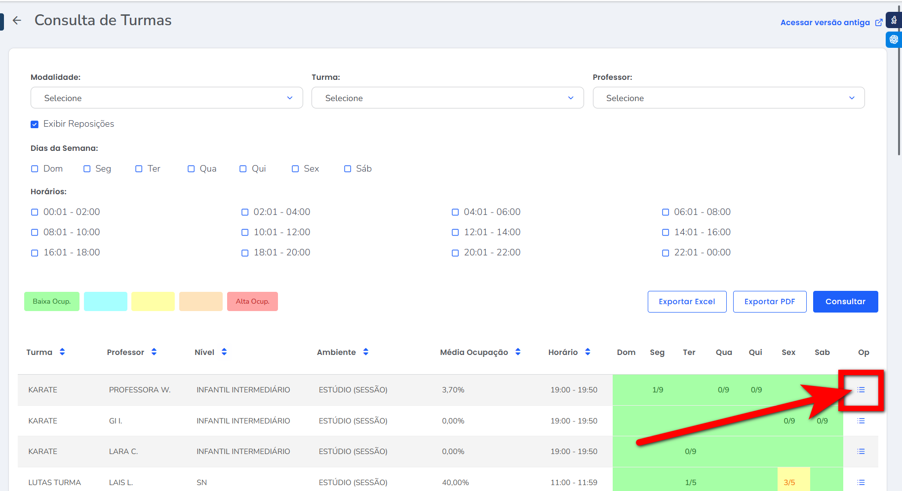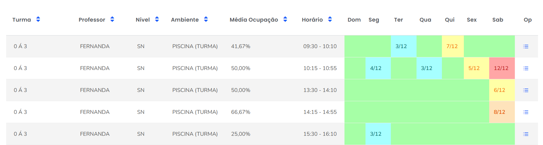 A partir dessa visão, fica mais simples analisar o comportamento das turmas no dia a dia, identificando quais têm mais marcações e reposições, quais estão com baixa ocupação e quais já operam com alta ocupação.