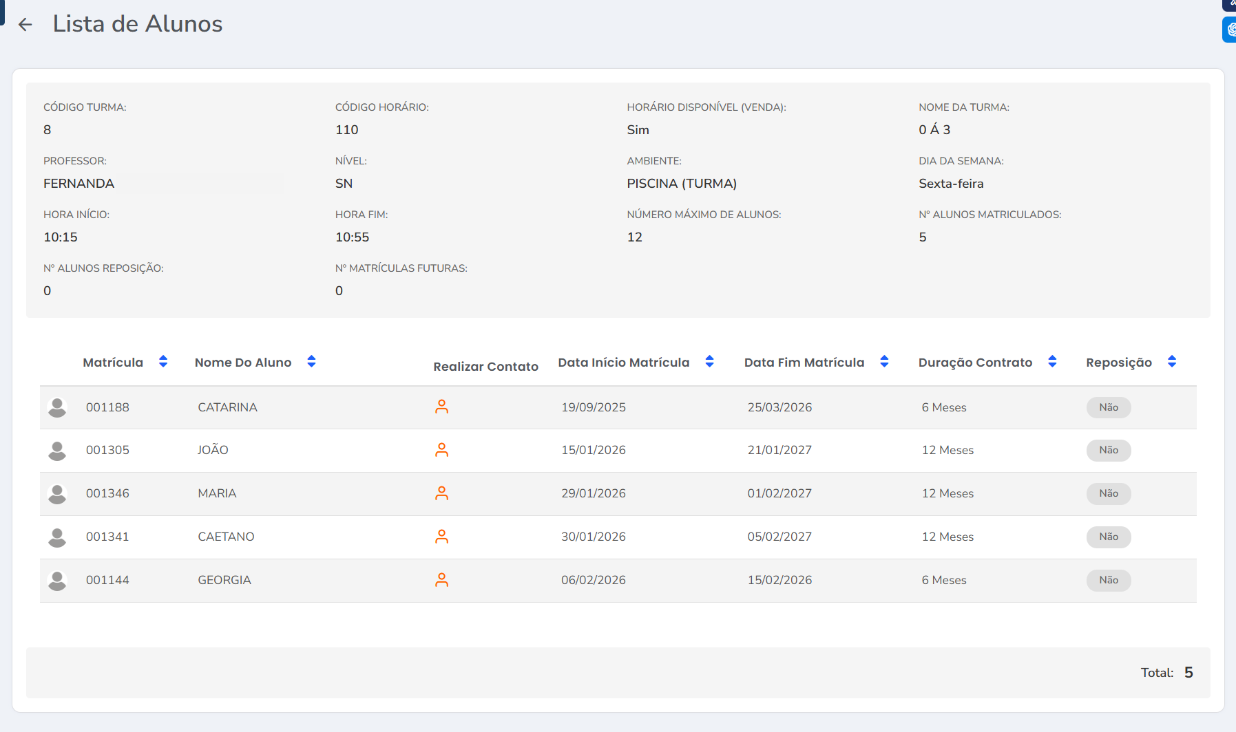 • Nº de matrículas futuras: apresenta a quantidade de alunos agendados com matrículas futuras nesta turma.