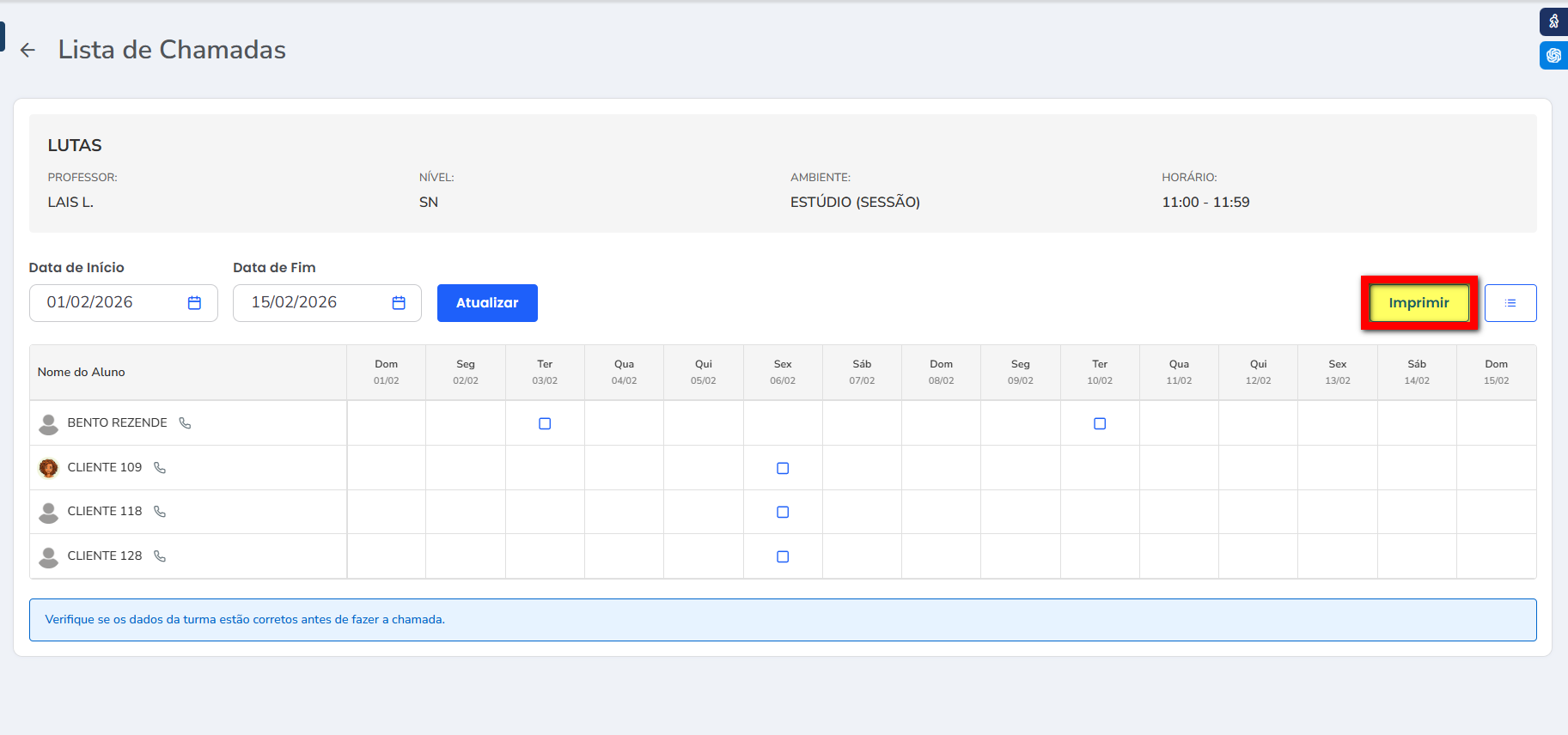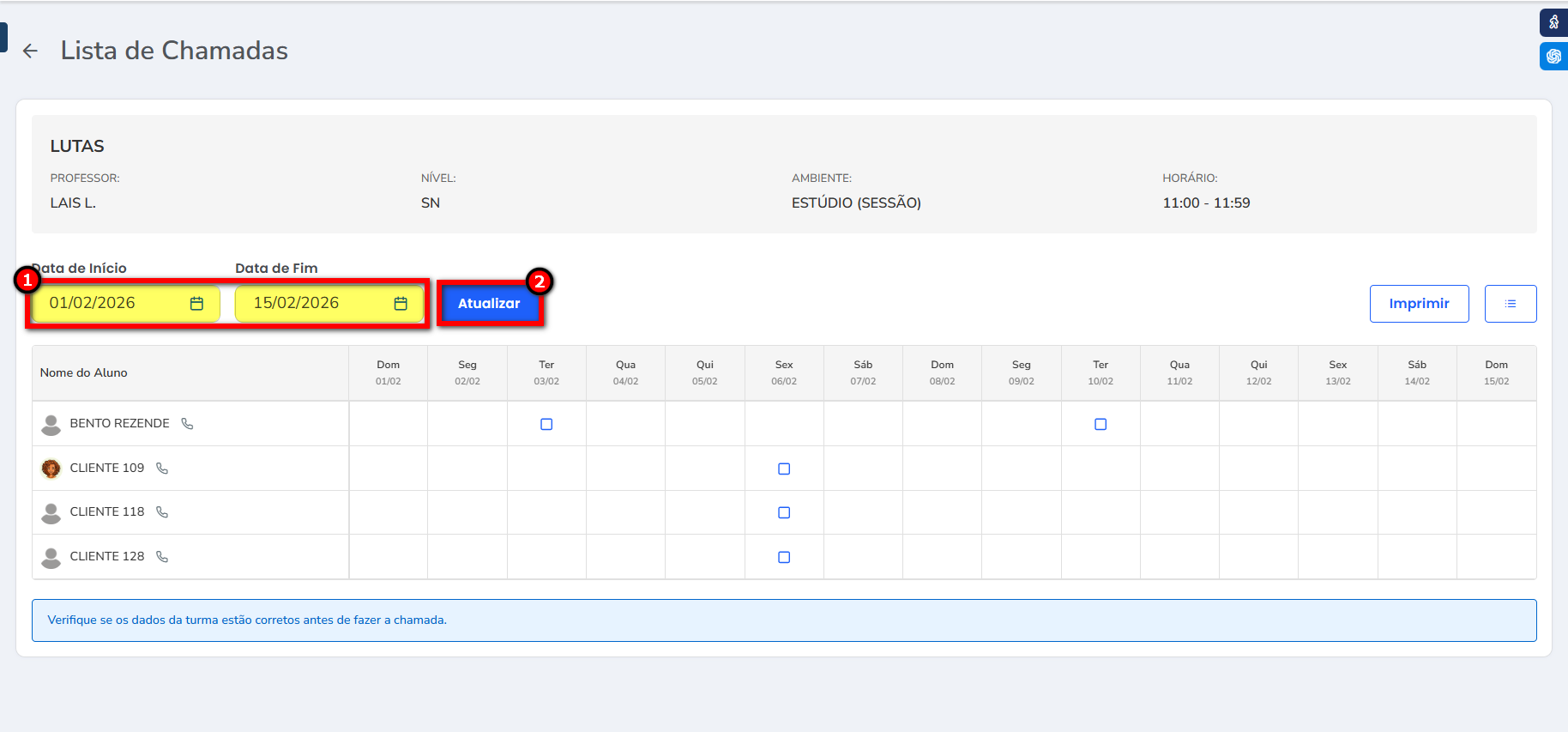 5.1. Nessa tela, é possível pesquisar por um período específico para visualizar os alunos da turma, com seus respectivos dias e horários;