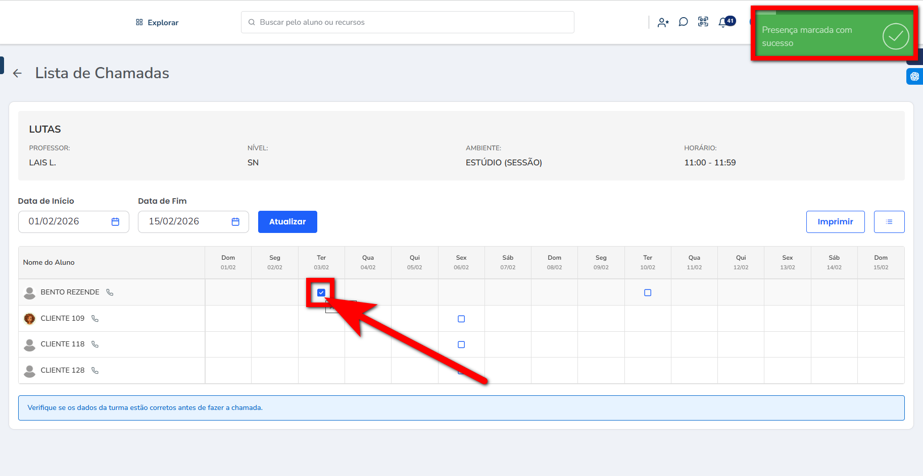 5.2. É possível registrar a presença do aluno marcando o checkbox correspondente;
