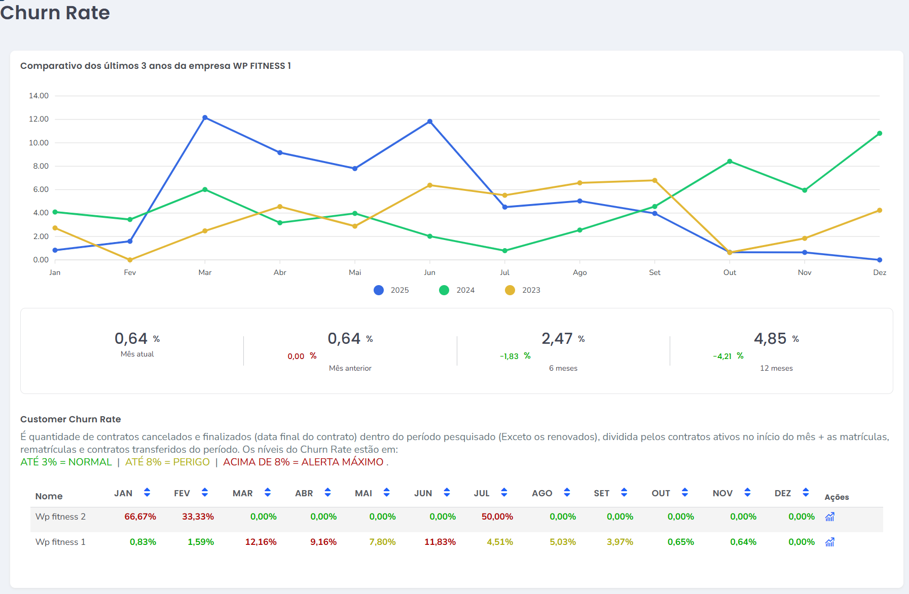 Churn Rate = (Contratos inativos que se encerraram naquele mês e não foram renovados (inativos) + Contratos cancelados que se encerraram naquele mês) / (Contratos ativos no início do mês + (Rematrículas que se iniciaram naquele mês + Matrículas que se iniciaram naquele mês + Transferências que se iniciaram naquele mês)) * 100.