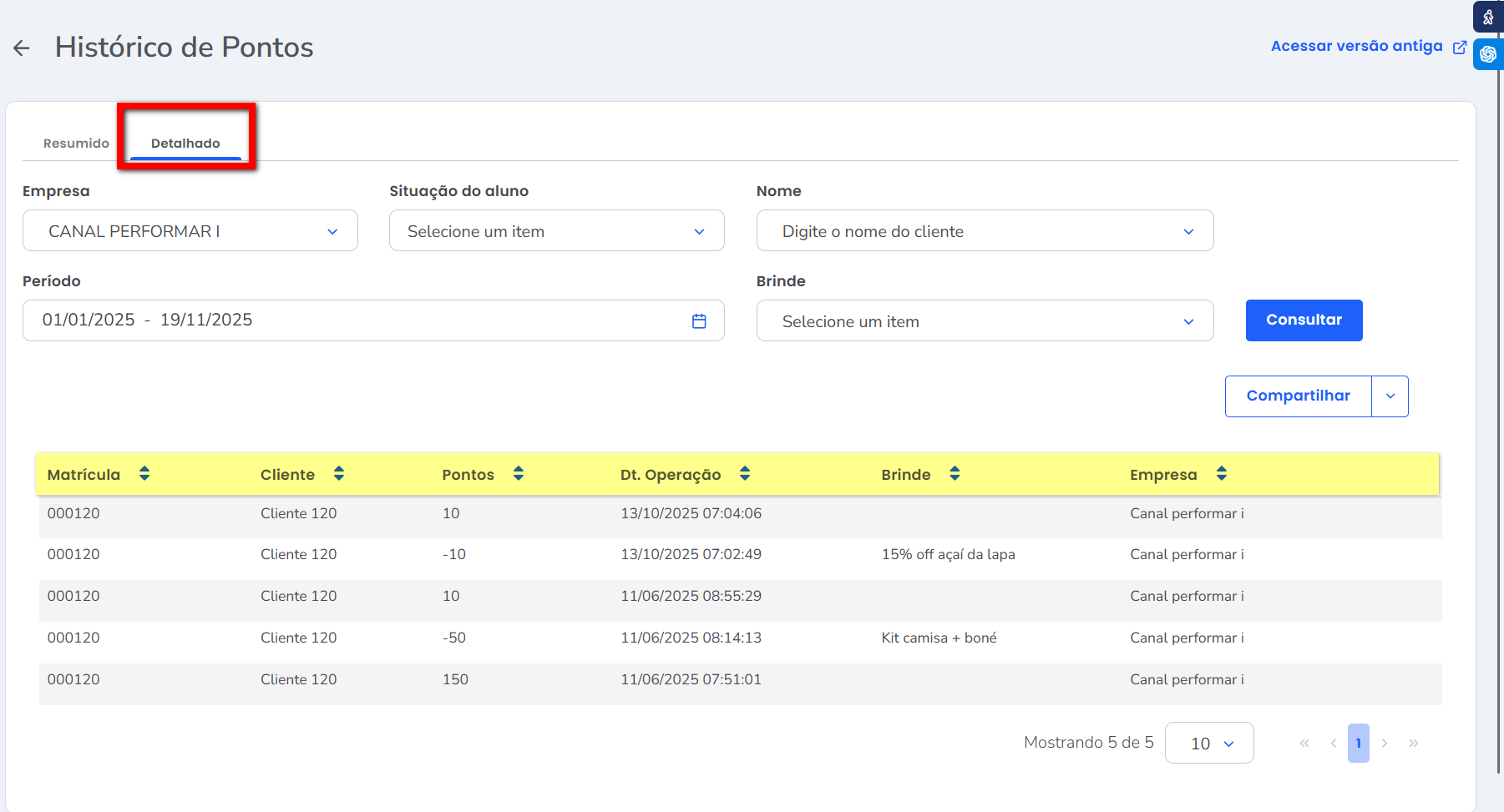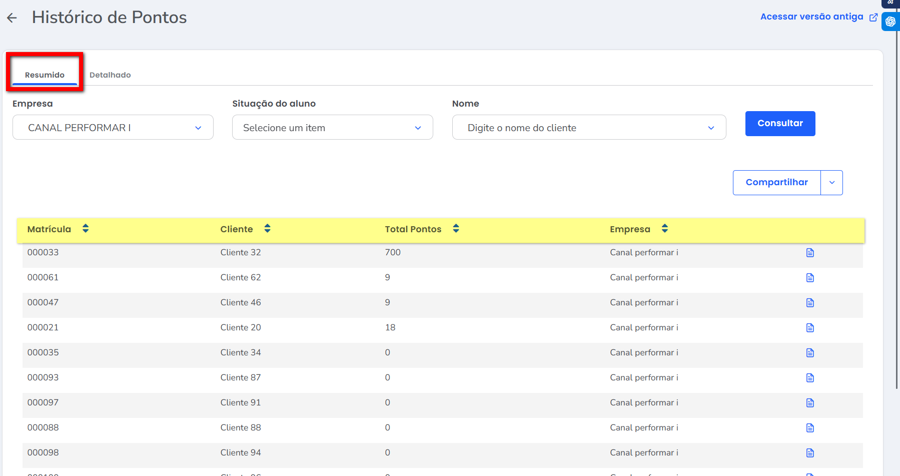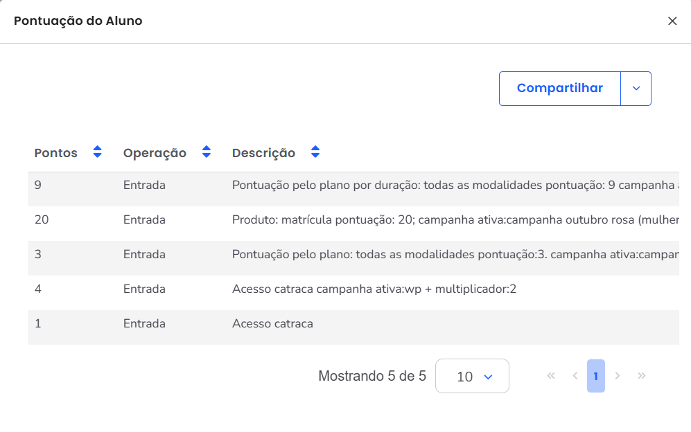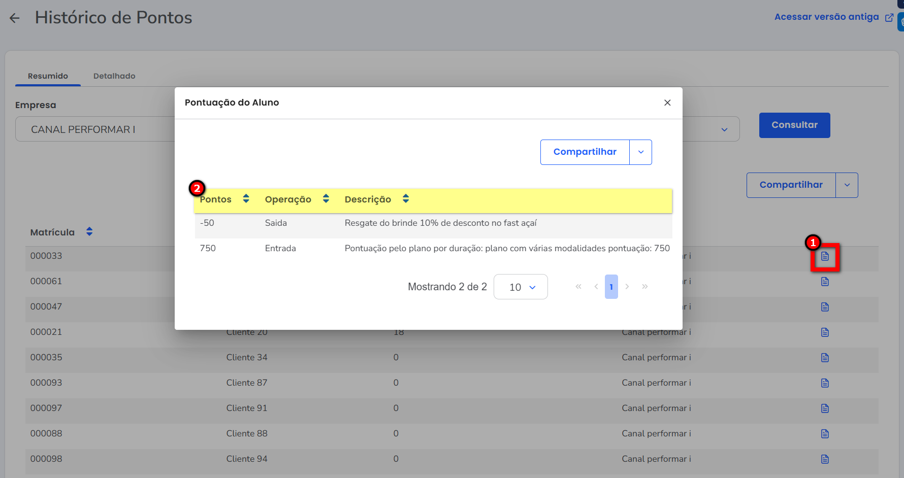 3. Aqui é possível verificar o histórico de pontos dos alunos usando filtros de pesquisa resumidos ou detalhados.