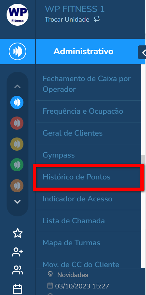 É necessário ter a permissão “5.67 – Visualizar relatório histórico de pontos” habilitada no perfil de acesso do módulo ADM.