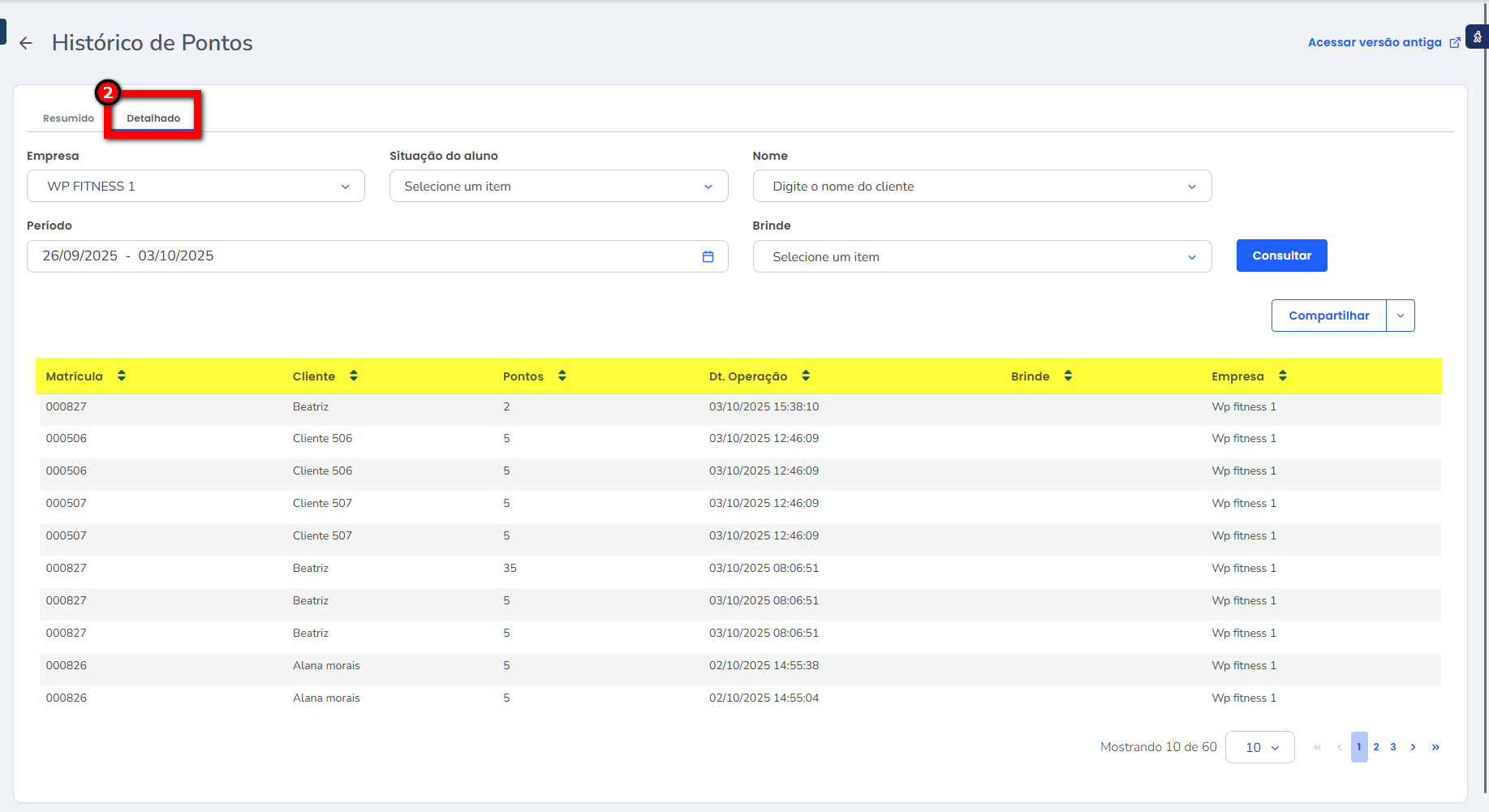 3. Aqui é possível verificar o histórico de pontos dos alunos usando filtros de pesquisa resumidos ou detalhados.