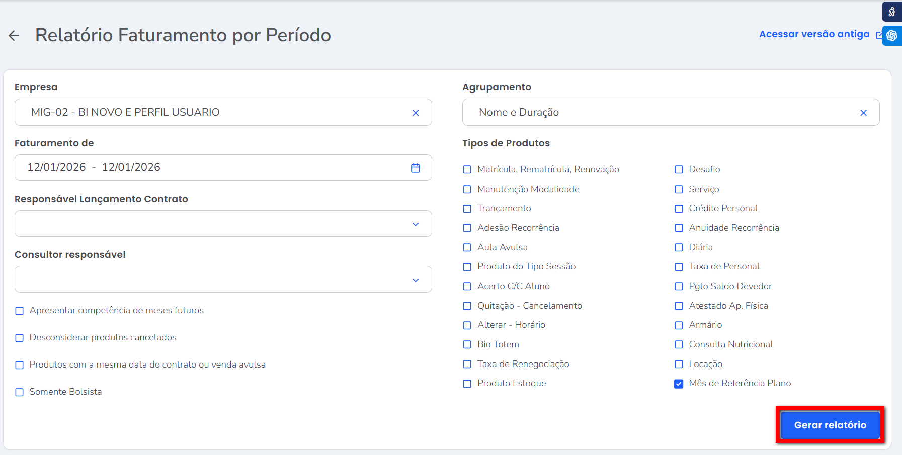 2. Será apresentada esta tela contendo o campo para informar o período que deseja consultar e alguns filtros para afunilar o relatório gerado. Selecione todos os filtros desejados, e clique no botão “Gerar Relatório“;