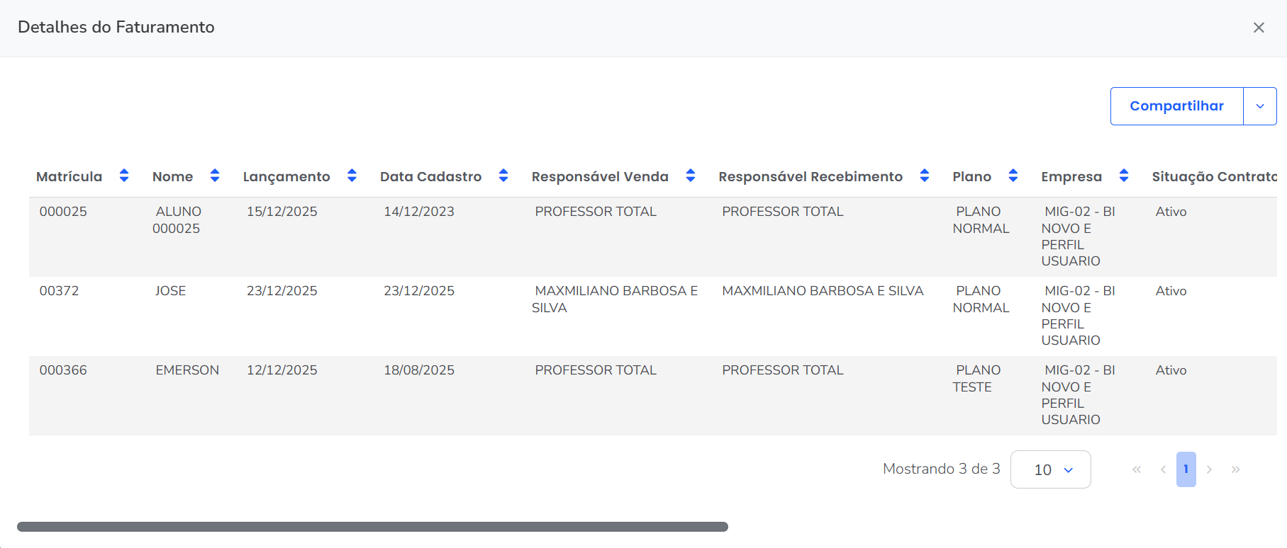 3.2. Caso deseje visualizar a lista de alunos que compõem este valor final, basta clicar no número que indica a quantidade acima do valor total, ou de cada produto/serviço.