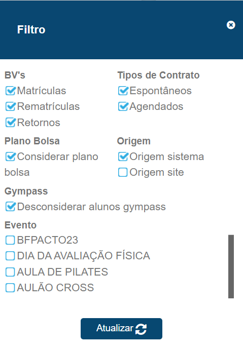 - Matrículas: apresenta a quantidade de visitantes que se matricularam, onde no campo “Dia” representa as visitas do dia pesquisado e “Mês” representa as matrículas do dia 01 do mês corrente, até o dia pesquisado;