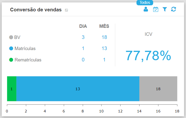 O Business Intelligence disponibiliza os indicadores mais importantes para uma empresa e entre os indicadores está o Conversão de Vendas. Nele podemos identificar quantos e quem são os clientes que visitaram a empresa e se realizaram matrícula ou rematrícula.