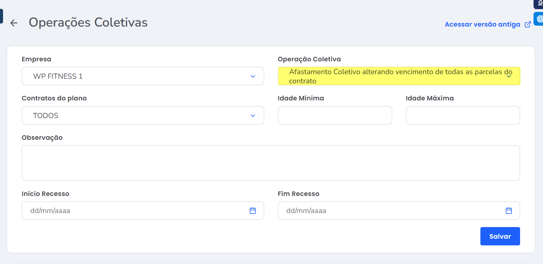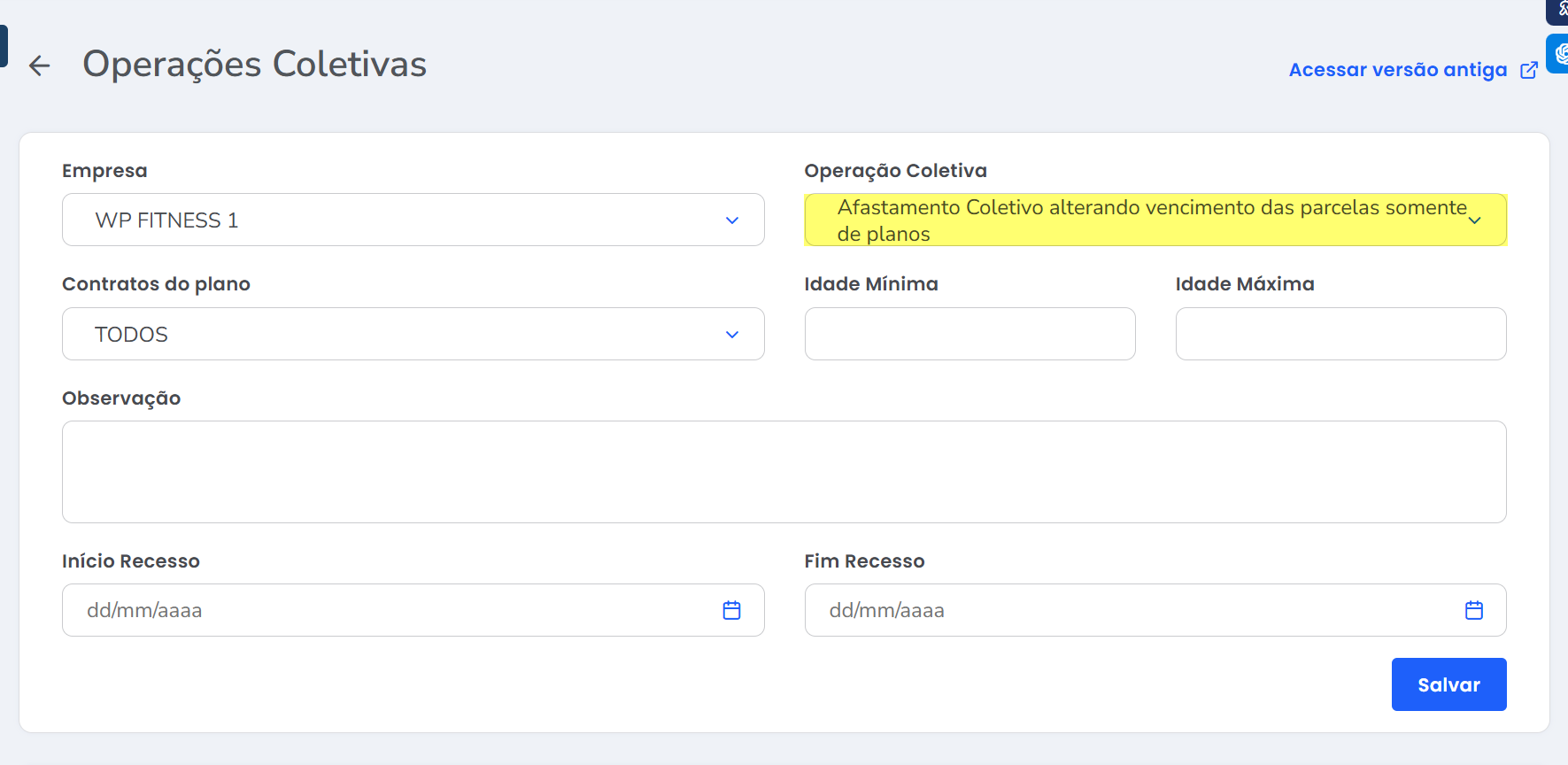 2. Em seguida, escolha qual operação coletiva deseja realizar e preencha os campos apresentados para cada operação;