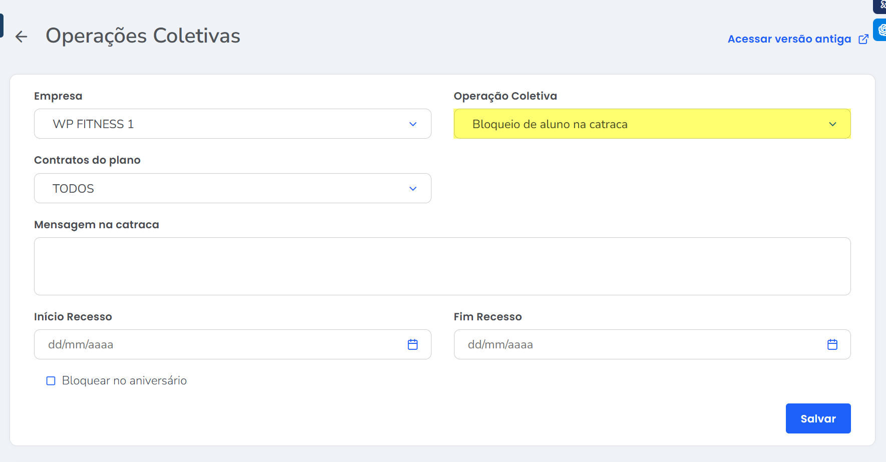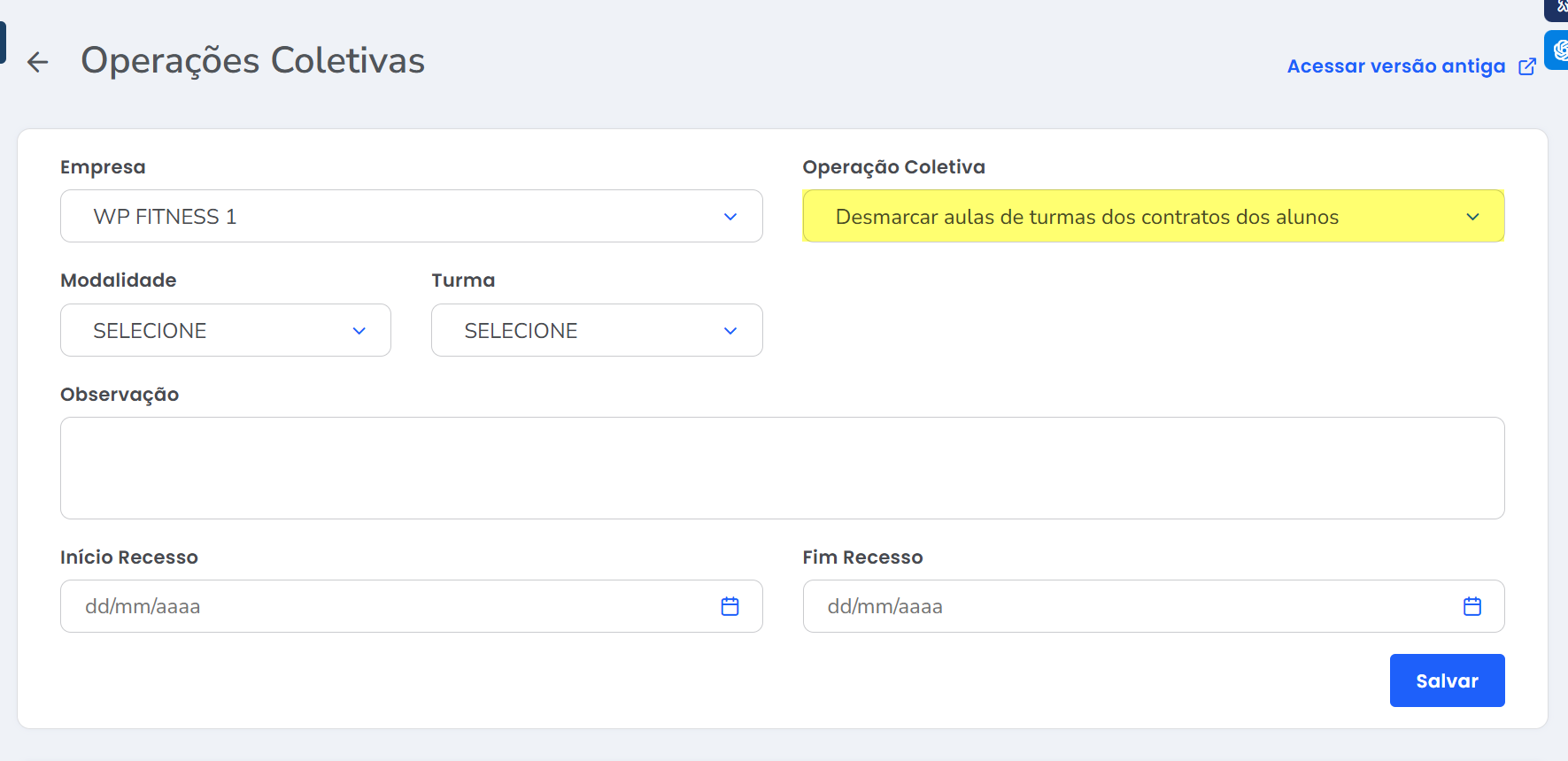 • Operação coletiva: selecione qual operação coletiva deseja realizar para os alunos da empresa;