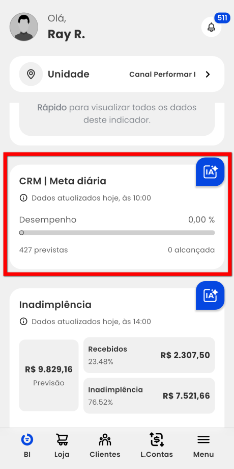 1. Após acessar o aplicativo na tela de “BI“, localize o indicador de “CRM | Meta diária“;