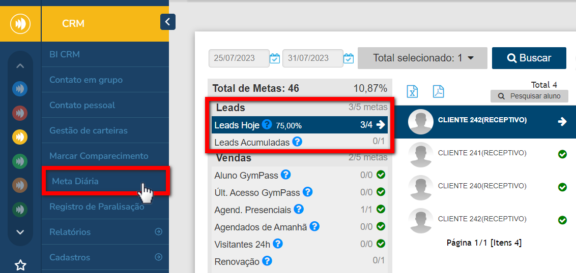 1. No módulo CRM, clique no menu “Meta Diária“;
