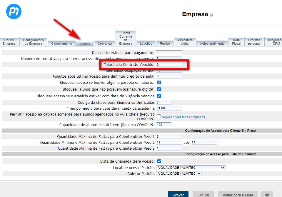 2. Selecione a empresa e na aba “Acesso” você vai encontrar “Tolerância Contrato Vencido”, nela você coloca quantos dias o seu aluno ainda poderá ter acesso à academia, após seu contrato estar vencido;