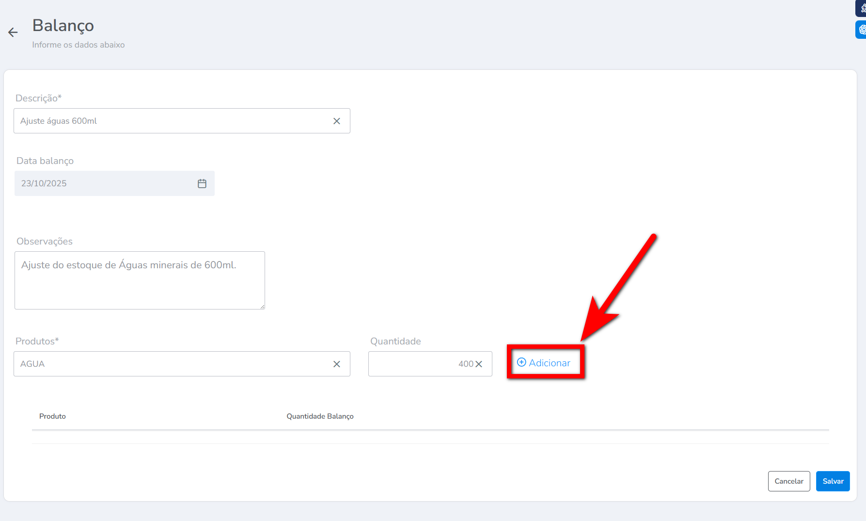 4. Após preencher os campos “Produto” e “Quantidade“, clique em “Adicionar”;