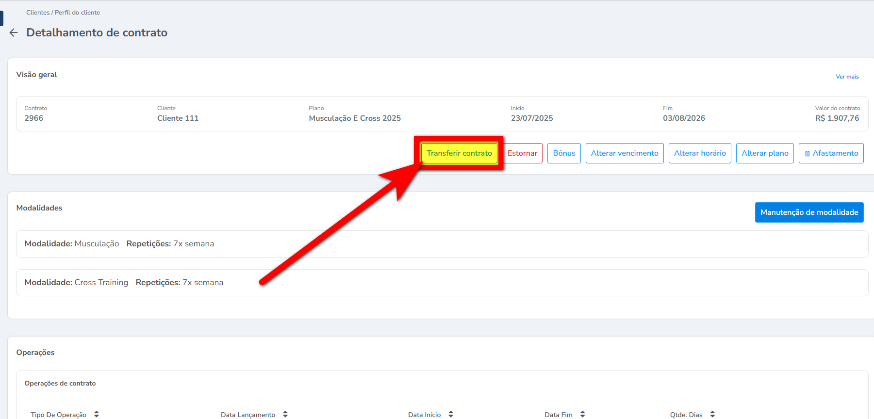 2.1. Caso o cliente possua um contrato com modalidades de turma, o sistema permitirá a transferência desse contrato. No entanto, o aluno original permanecerá vinculado à turma, e essa substituição não será feita automaticamente para o novo aluno que receber o contrato.