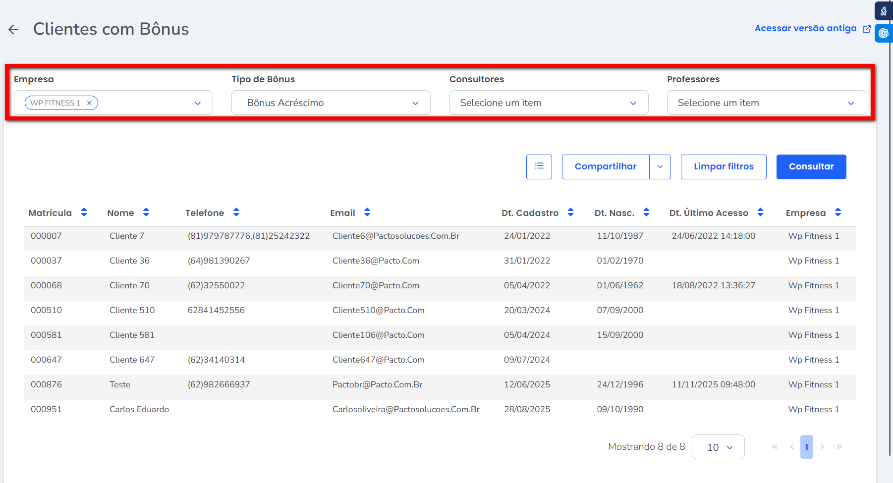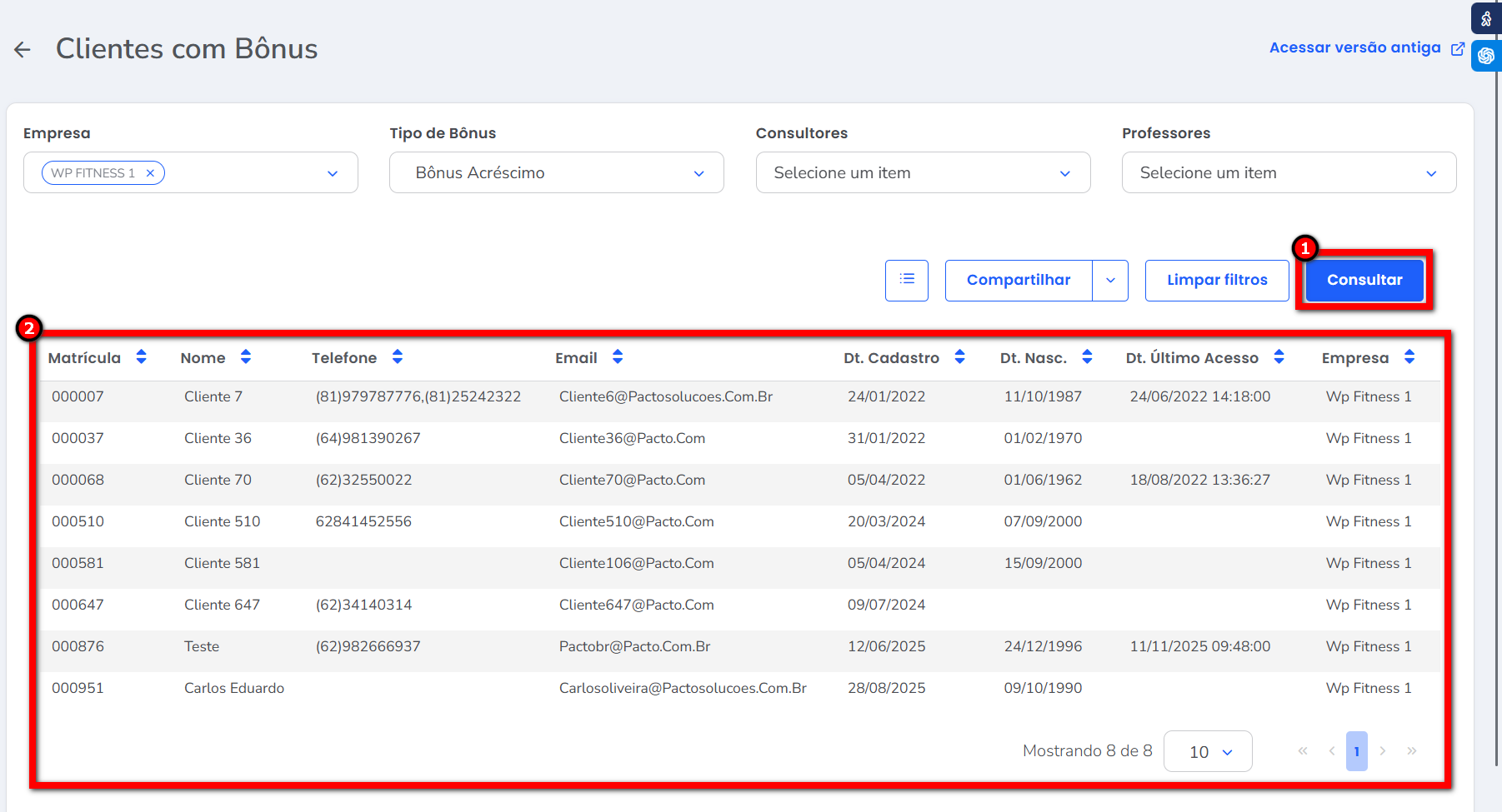 3. Após aplicar os filtros desejados, clique em “Consultar” e será gerado um relatório indicando os clientes que atualmente estão com bônus.
