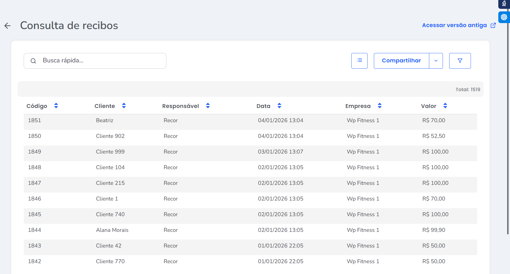 2. O sistema apresentará uma nova tela com a listagem de todas as pessoas — clientes e colaboradores — que possuem recibos registrados.
