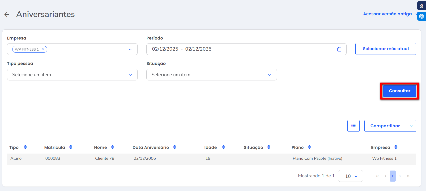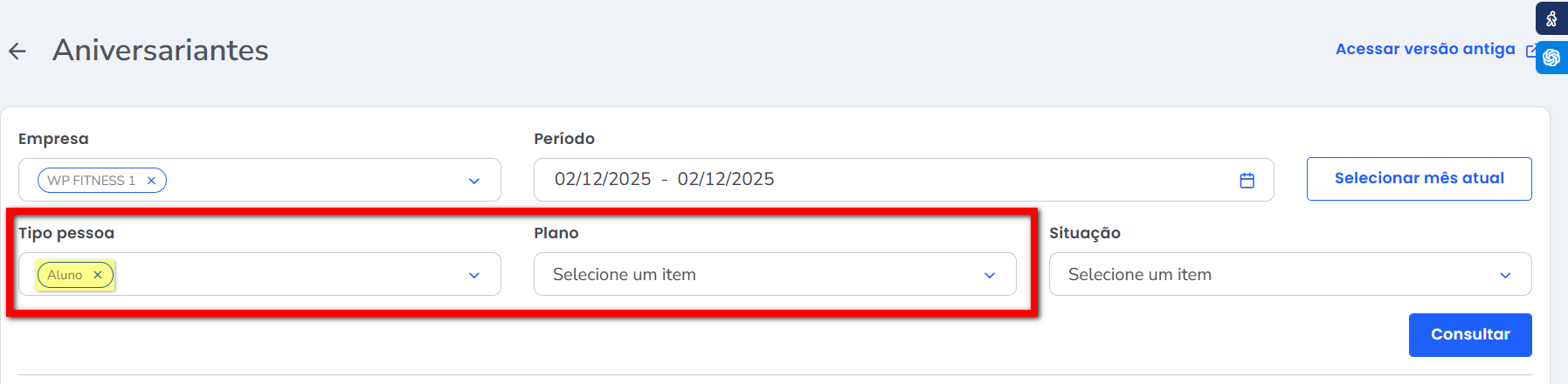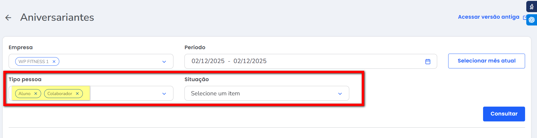 - Pessoa: selecione qual o tipo de pessoa que deseja visualizar a lista de aniversariantes;