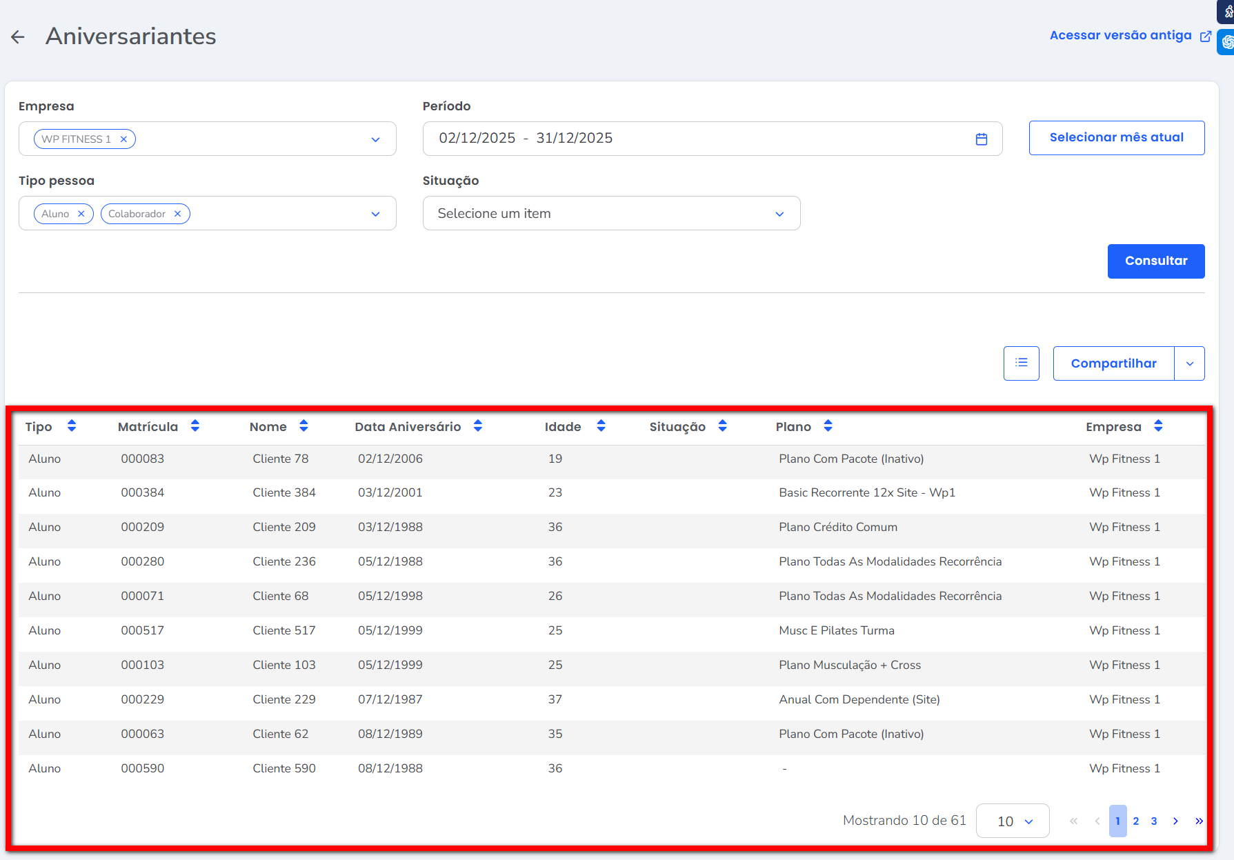 4. Será apresentada a listagem com os aniversariantes de acordo, com os filtros selecionados.
